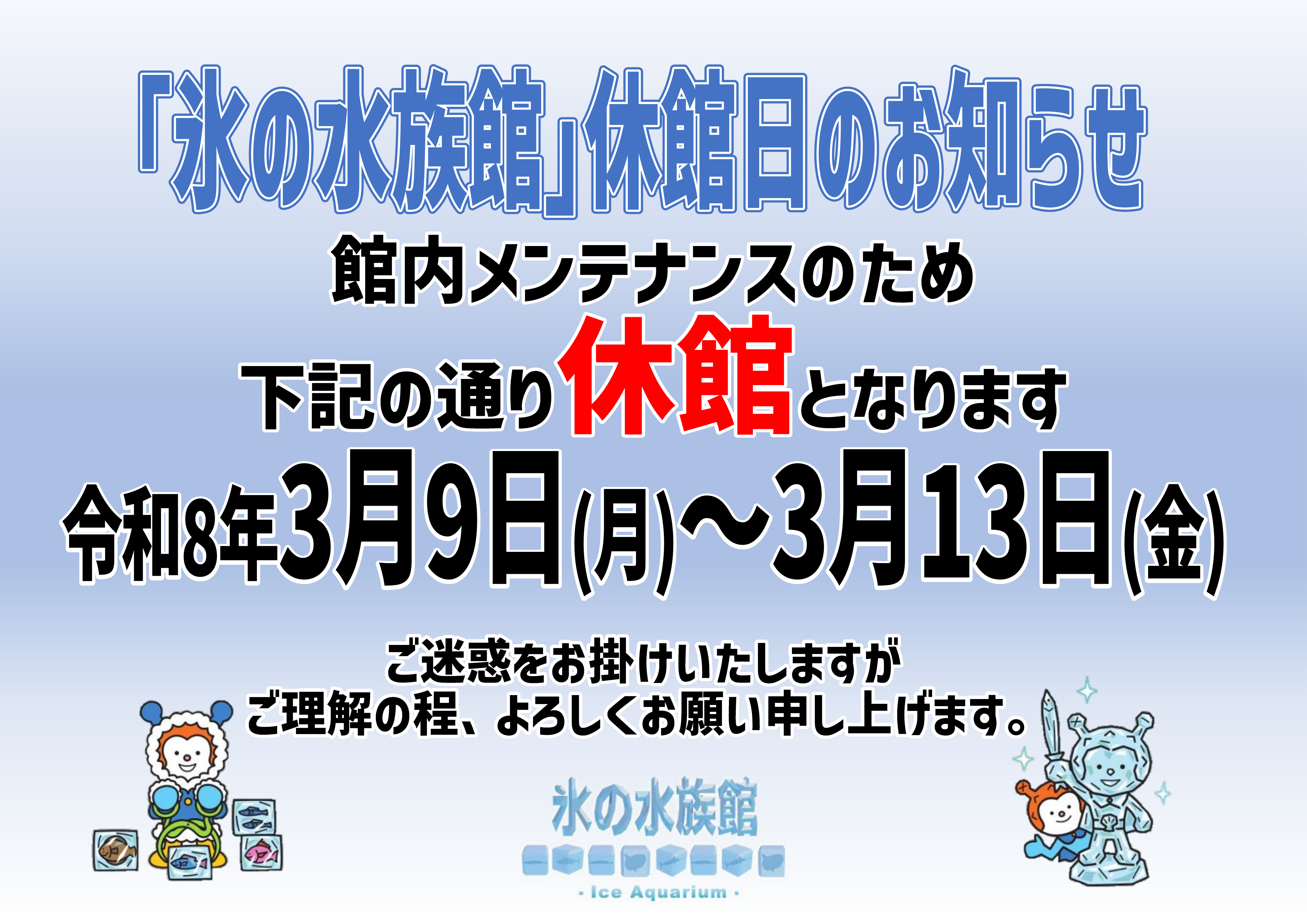 館内メンテナンスのため下記の通り休館となります。 令和7年3月9日(月)~3月13日(金) ご迷惑をお掛けいたしますが、ご理解の程よろしくお願い申し上げます。