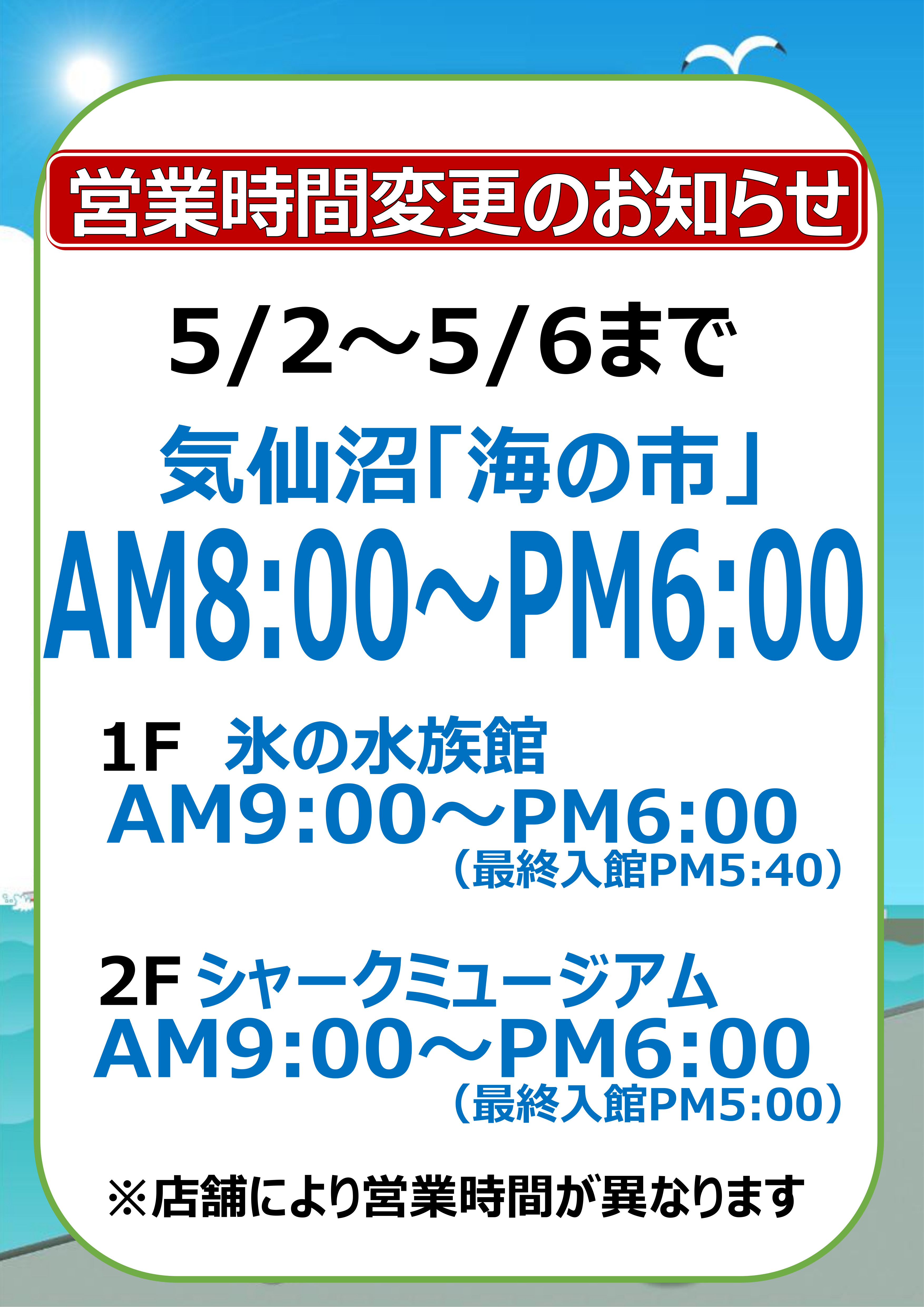 5月1日より9月30日までの間、気仙沼「海の市」の営業時間は以下の通りとなります。